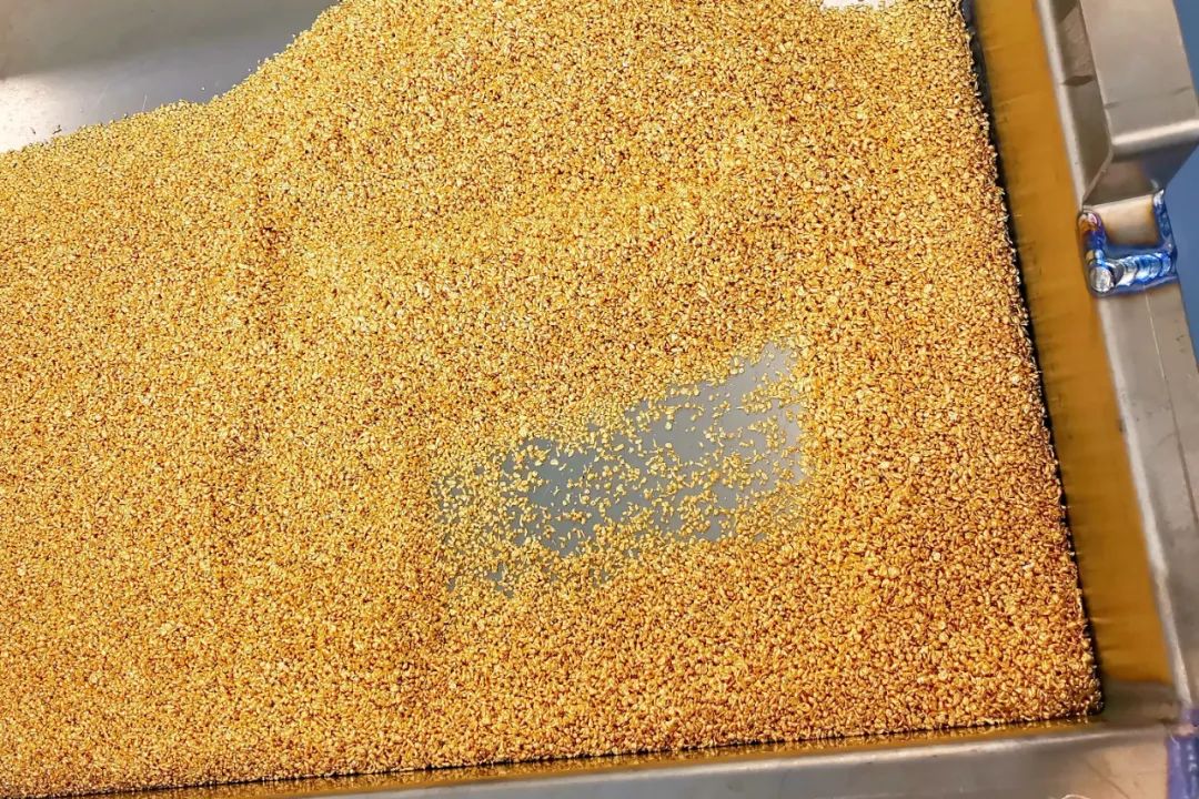 熔金后取樣送檢,質(zhì)檢部出具化驗報告。等化驗報告確認金料沒有問題后,后一步就是壓片提純了。壓片就是將黃金壓成很薄的片狀,一般三十公斤金料需要一個小時。壓片工序結(jié)束后,這些金片會被送到精煉溶金車間去溶金提純。